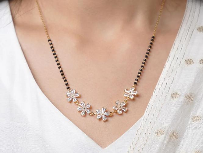 काळ्या मण्यांच्या पारंपरिक साखळीला फुलांची नक्षी जोडल्यामुळे परंपरा आणि आधुनिक फॅशन यांचा सुंदर मिलाफ दिसतो.