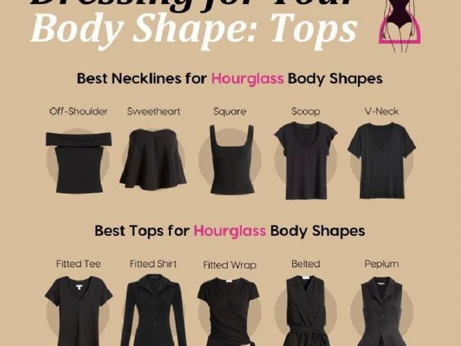 आवरग्लास बॉडीमध्ये खांदे आणि हिप्स समप्रमाणात असतात. कंबर बारीक असते. हा परफेक्ट बॉडी शेप मानला जातो. यांना पेपलम किंवा शरीराला चिकटून बसणारे टॉप्स छान दिसतात. क्रॉप-टॉप देखील निवडू शकता. कमरेला बेल्ट लावून कर्व्सना हायलाईट करू शकता.