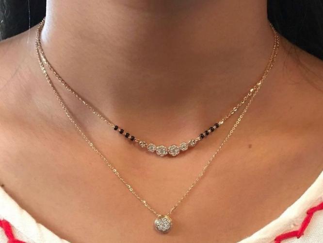 गोल्ड-प्लेटेड अमेरिकन डायमंड मंगळसूत्र सध्या ट्रेंडमध्ये आहे. काळ्या मण्यांची दुहेरी पदरी साखळी यात असते. हे ऑफिसवेअर किंवा इंडो-वेस्टर्न कपड्यांवर अतिशय सुंदर दिसतात.