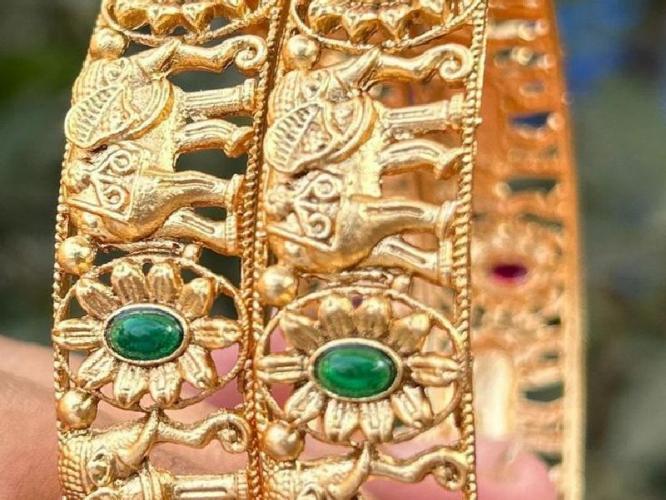 मल्टीकलर स्टोन्स वर्क एलीफेंट डिझाइन बांगड्या हा पारंपारिक राजेशाही कलाकुसर आणि आधुनिक रंगीबेरंगी फॅशनचा एक अप्रतिम मिलाफ आहे. साध्या सोन्याच्या बांगड्यांपेक्षा या बांगड्या अधिक उठावदार आणि स्टायलिश दिसतात.