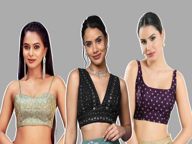 पार्टीवेअर किंवा शिफॉन साड्यांसाठी नूडल स्ट्रॅप ब्लाऊज सध्या खूप ट्रेंडमध्ये आहेत. हे तुम्हाला एकदम बोल्ड आणि ग्लॅमरस लूक देतात. विशेषतः काळ्या किंवा चंदेरी रंगात हे अधिक सुंदर दिसतात.