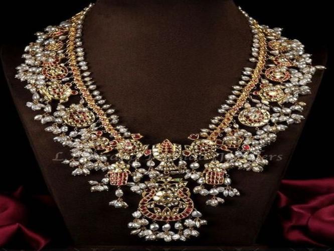 हा लांब हार विशेषतः कांजिवरम किंवा पैठणी साडीवर अतिशय सुंदर दिसतो. सोन्याच्या नाजूक नक्षीवर मोत्यांचे असंख्य घोस या हाराचे मुख्य आकर्षण असतात.