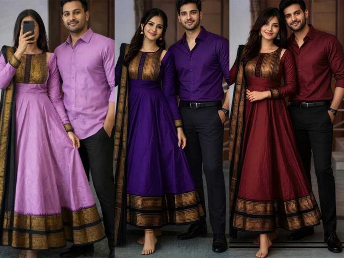 1 / 8सध्याच्या काळात कपल्समध्ये ट्विनिंग किंवा मॅचिंग कपड्यांची मोठी क्रेझ आहे. लग्नसमारंभ असो, साखरपुडा किंवा इतर कोणताही खास प्रसंग असो अनेक कपल्सला मॅचिंग आउटफिट कॅरी करण्याची हौस असते.(Couple matching outfits)2 / 8लग्नसमारंभात दाक्षिणात्य पेहरावाचा एक वेगळाच थाट असतो. आपल्याला या वेळी साडी नेसणे कठीण वाटत असेल, पण साडीचा लूक हवा असेल, तर हे अनारकली स्टाईल साडी ड्रेस आपल्यासाठी चांगला पर्याय ठरेल. यामध्ये कपल्स कॉम्बिनेशन देखील सुंदर करता येते. इतकंच नाही तर हे १५५० रुपयांत मिळते. (Matching dress and shirt for couples) 3 / 8लग्न कार्य किंवा संध्याकाळच्या रिसप्शेनसाठी वाइन किंवा मरुन रंग हा चांगला दिसतो. कपल्ससाठी हा रंग अधिक उठून दिसतो. 4 / 8जर आपल्याला पारंपरिक आणि आधुनिक स्टाइल करायच असेल तर गडद जांभळ्या रंगाचे कपडे स्टाइल करु शकता. 5 / 8पोपटी रंगाचा ड्रेस आणि त्यावर मुलांसाठी पोपटी रंगाचा शर्ट हा पारंपरिक आणि ग्रेसफुल लूक देतो.6 / 8मस्टर्ड यलो रंग हा दक्षिण भारतीय फॅशनची खरी ओळख सांगणारा रंगसंगम. सणासुदीला हा लूक खास उठून दिसतो.7 / 8आधुनिक आणि सॉफ्ट लूक देणारा पर्याय नारंगी रंग. लग्न कार्यात किंवा सणसमारंभात हा रंग अधिक छान दिसतो. 8 / 8डॅशिंग आणि प्रोफेशनल कपल लूकसाठी नेव्ही ब्लू रंग अधिक छान आणि उठून दिसतो.