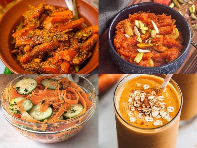 1 / 7गाजराचे पदार्थ करण्याच्या सोप्या रेसिपी पाहा. चवीला एकदम मस्त आणि पौष्टिक असे पदार्थ. गोडसर गाजर आहारात घेण्यासाठी हे पदार्थ खा. 2 / 7कच्च्या गाजरापासून केलेली कोशिंबीर हलकी आणि पचनास सोपी असते. त्यात कडीपत्ता, मोहरीची फोडणी आणि लिंबाचा रस घातल्याने चव वाढते. रोजच्या जेवणात ही कोशिंबीर ताजेपणा आणते.3 / 7गाजराची भाजी साधी फोडणी देऊन किंवा वाटण घालून करता येते. ही भाजी गोडसर चवीची असल्याने लहान मुलांनाही आवडते. पोषणमूल्यांनी भरलेली असल्यामुळे रोजच्या आहारात उपयुक्त ठरते.4 / 7दुधात शिजवलेले गाजर, साखर किंवा गूळ आणि थोडे तूप घालून तयार केलेला हलवा खास लोकप्रिय आहे. हिवाळ्यात हा पदार्थ शरीराला उष्णता देतो. सण-समारंभात गाजराचा हलवा आवर्जून केला जातो.5 / 7गाजराचे सूप हलके, पौष्टिक आणि पोटाला आराम देणारे असते. थंडीत किंवा आजारपणात हे सूप विशेष फायदेशीर ठरते. लहान मुलांपासून ज्येष्ठांपर्यंत सर्वांसाठी योग्य असा हा पदार्थ आहे.6 / 7किसलेले गाजर कणकेत मिक्स करुन केलेला पराठा चविष्ट लागतो. नाश्त्यासाठी किंवा डब्यासाठी हा पराठा उत्तम पर्याय आहे. दही किंवा लोणच्यासोबत तो छान लागतो.7 / 7ताज्या गाजरांपासून केलेला ज्यूस आरोग्यासाठी खूप लाभदायक असतो. तो शरीराला ऊर्जा देतो आणि त्वचेसाठीही उपयुक्त ठरतो. सकाळी उपाशीपोटी घेतल्यास त्याचा जास्त फायदा होतो.
