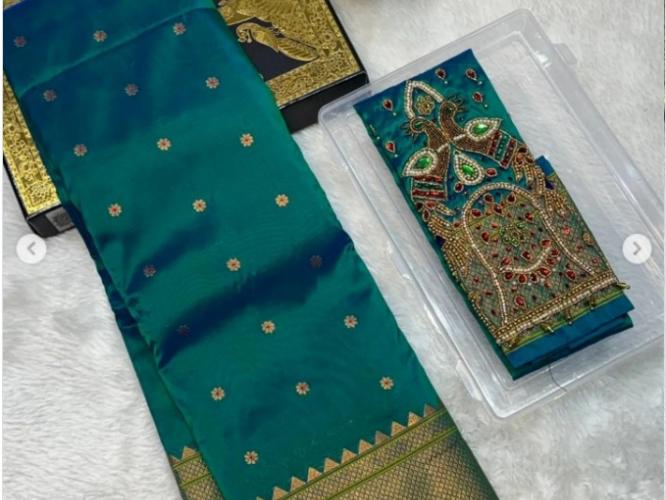 कलांजली पैठणी (Kalanjali Butta Paithani) आणि एम्ब्रॉयडरी ब्लाऊज यांमधील मिलाफ हा भारतीय पारंपारीक वस्त्रांमधील सौंदर्याचा एक उत्कृष्ट नमुना आहे. (Kalanjali Paithani With Aari Work Blouse)