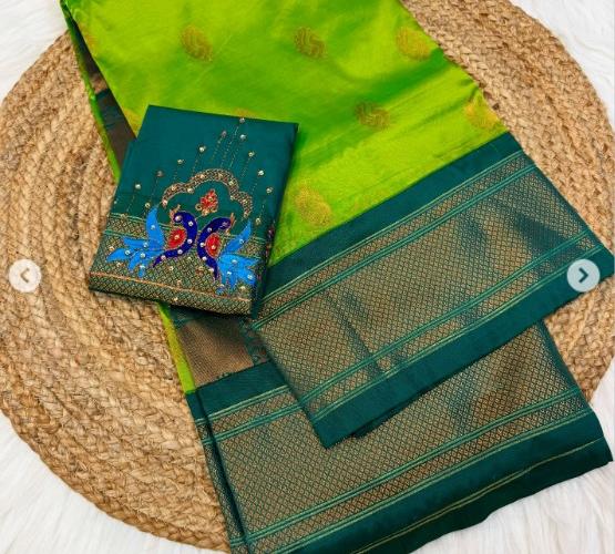 सध्या ही साडी एका प्रिमियम आरी वर्क ब्लाऊज पीससोबत उपलब्ध आहे. आरी वर्क हे हातानं केलेलं सुबक नक्षीकाम असून ब्लाऊजच्या गळ्यावर आणि हातावर मोराची किंवा फुलांची डिझाईन केलेली असते