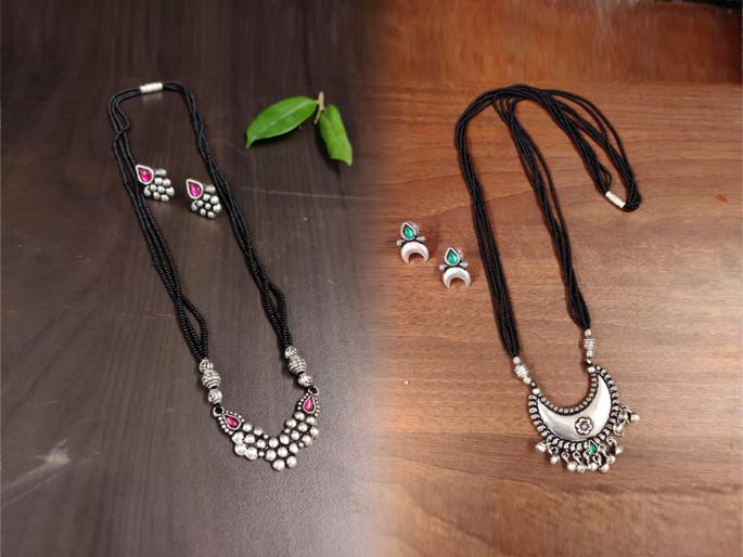 1 / 10१. सोनेरी मणी असणारं किंवा मग स्टाेनचं पेंडंट असणारं आर्टिफिशियल मंगळसूत्र आपण नेहमीच घालतो. आता यंदाच्या नवरात्रीसाठी काहीतरी खास आणि वेगळं घ्या.. आर्टिफिशियल मंगळसूत्रांमध्ये सध्या ऑक्सिडाईज मंगळसूत्रांना चांगलीच मागणी आहे. त्याचेच हे काही खास प्रकार.2 / 10२. दसरा- दिवाळी या सणांनिमित्त सध्या आपल्या शहरातल्या लोकल बाजारात तसेच ऑनलाईन शॉपिंग साईटवर ऑक्सिडाईज प्रकारातले अनेक मंगळसूत्र उपलब्ध आहेत. खणाच्या साड्यांची क्रेझ होती तेव्हा फक्त साडीवर शोभणारे ठसठशीत ऑक्सिडाईज मंगळसूत्र मिळायचे. 3 / 10३. पण आता मात्र ऑक्सिडाईज मंगळसूत्रांमध्ये अनेक नाजूक प्रकार उपलब्ध आहेत. अगदी जीन्सवरही तुम्ही ते घातले तरी ते बिलकूल वेगळं दिसणार नाही4 / 10४. फक्त असा एक मोठा मणी आणि काळ्या मण्यांची पोत अशा प्रकारचं हे मंगळसूत्र एखाद्या कॉटनच्या साडीप्रमाणेच ड्रेसवरही शोभून दिसतं.5 / 10५. त्यातलाच हा एक प्रकार. यातले पेंडंट आणि गळ्यातली पोत हे दोन्हीही आणखीनच नाजूक आहेत. ऑनलाईन शॉपिंग साईटवर १५० ते २०० रुपयांत हे मंगळसूत्र मिळते आहे. 6 / 10६. या मंगळसूत्रात वाट्यांच्या ऐवजी दोन सुंदर फुलं वापरण्यात आली आहेत. तशाच प्रकारचे कानातले घेतले तर तो एक सुंदर सेट तुमच्याकडे होऊ शकतो.7 / 10७. नथीचं डिझाईन असणारं पेंडंट असा प्रकार आपण आपल्या रेग्युलर मंगळसूत्रांमध्ये नेहमीच बघतो. आता हा प्रकार ऑक्सिडाईज मंगळसूत्रांमध्येही बघायला मिळत आहे. 8 / 10८. नाजूक पेंडंट प्रकारातलं हे आणखी एक सुंदर डिझाईन. लोकल मार्केटमध्ये अगदी १०० रुपयांपासून यातले वेगवेगळे प्रकार मिळू शकतात.9 / 10९. अशा पद्धतीचं मंगळसूत्र एखाद्या कॉटन किंवा प्लेन साडीवर घातलं तर तुम्ही नक्कीच अधिक ट्रेण्डी दिसू शकता. सणासुदीच्या दिवसांत ऑफिसमध्ये साडी नेसून जाण्याचा प्लॅन असेल, तर असं एखादं मंगळसूत्र आपल्या कलेक्शनमध्ये असायलाच हवं.10 / 10