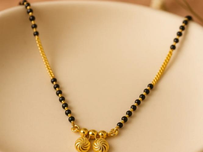मिनिमलिस्ट सॉलिटेअर डिझाईन्समध्ये काळ्या मण्यांच्या नाजूक साखळीत मध्यभागी एकच मोठा हिरा किंवा सोन्याचा गोल मणी असतो. हे डिझाईन्स ऑफिस वेअर आणि वेस्टर्न कपड्यांवर अत्यंत मोहक दिसतात.