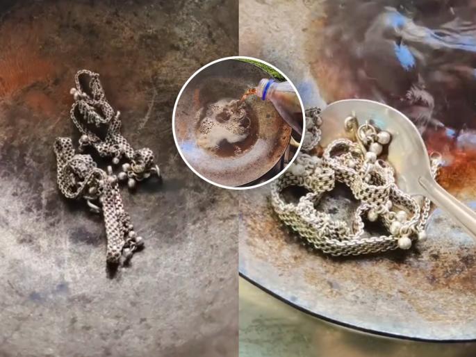 1 / 8गौरी- गणपतीचे दिवस आता जवळ आले आहेत. त्यामुळे सणासुदीच्या दिवसांत छान छान दागिने, साड्या, पारंपरिक कपडे घालून सजणं ओघाने आलंच..2 / 8म्हणूनच या दिवसांत घालण्यासाठी चांदीचे दागिने अगदी आतापासूनच स्वच्छ करून ठेवा. म्हणजे मग कधीही वेळ आली की छान चमकदार दागिने अगदी झटपट घालता येतील.3 / 8हा उपाय करून तुम्ही चांदीचे पैंजन, गळ्यातल्या माळा, साखळ्या, कानातले , बांगड्या असे चांदीचे वेगवेगळे दागिने स्वच्छ करू शकता.4 / 8हा उपाय करण्यासाठी सगळ्यात आधी गॅसवर एक तवा गरम करायला ठेवा. तवा गरम झाल्यानंतर त्यावर चांदीचे दागिने टाका.5 / 8आता गरम तव्यावर चांदीचे दागिने घातल्यानंतर ते थोडे हलवा जेणेकरून ते सगळीकडून गरम होतील.6 / 8आता गरम तव्यावर आणि गरम झालेल्या दागिन्यांवर कोणतेही सोडा असणारे सॉफ्ट ड्रिंक घाला. 7 / 8सॉफ्ट ड्रिंकऐवजी तुम्ही त्यावर बेकिंग साेड्याचं पाणीही घालू शकता. या पाण्यामध्ये चांदीचे दागिने चांगले बुडायला हवे. साधारण २ ते ३ मिनिटांनी दागिने तव्यावरून खाली घ्या. आणि स्वच्छ पाण्याने धुवून घ्या.8 / 8काळे पडलेले चांदीचे दागिने अगदी नव्यासारखे लख्खं चमकलेले दिसतील.