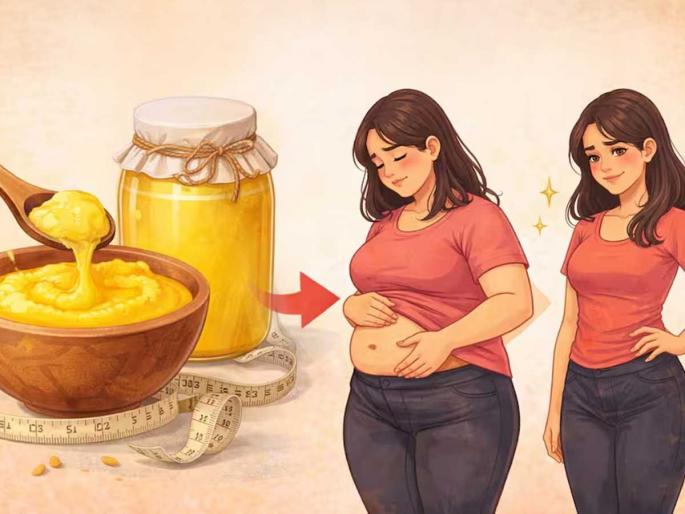 १. कोमट पाण्यासोबत चमचाभर साजूक तूप खा :- जर तुम्हाला वजन कमी करायचे असेल, तर सकाळी रिकाम्या पोटी एक ग्लास कोमट पाण्यासोबत शुद्ध साजूक तूप खाऊ शकता. कोमट पाण्यात तूप मिसळून घेतल्याने शरीराला खूप फायदा होतो. यामुळे मेटाबॉलिझमचा वेग वाढतो आणि पचनक्रिया ॲक्टिव्ह राहते, ज्यामुळे वजन कमी करण्यास मदत होते. या पद्धतीमुळे शरीरातील विषारी घटक (Toxins) सहजपणे बाहेर पडतात. साजूक तूप आतड्यांसाठी एखाद्या वंगणाप्रमाणेच काम करते, ज्यामुळे बद्धकोष्ठाचा त्रास दूर होतो. जेव्हा तुमचे पोट व्यवस्थित साफ राहते, तेव्हा वजन कमी करण्याची प्रक्रिया अधिक वेगाने होते.