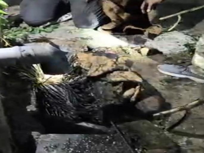 Web Summary : A porcupine, fleeing dogs, got trapped in a drain in Sangli. After a 4.5-hour rescue, rescuers drilled through concrete, saving it. Two were injured by its quills. The porcupine was released back into its natural habitat.