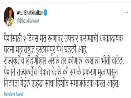 सांगलीतील या धक्कादायक घटनेनंतर भाजपाचे नेते अतुल भातखळकर यांनी राज्य सरकारवर निशाणा साधला आहे. पैशांसाठी २ दिवस मृत रुग्णावर उपचार करण्याची धक्कादायक घटना महाराष्ट्रात इस्लामपूर येथे घडली आहे. राज्यकर्तेच खंडणीखोर असले तर कोणाला कशाला भीती वाटेल. पैशाने राज्यकर्तेच विकत घेतले की सगळे प्रकरण मूळापासून मिटवता येईल एवढा साधा हिशोब समाजकंटक करत आहेत, अशी टीका अतुल भातखळकर यांनी केली आहे.