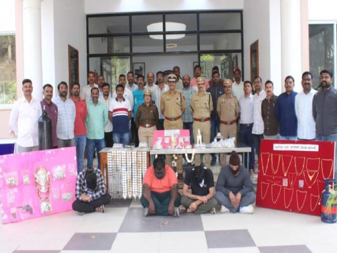 सांगली : झरे (ता. आटपाडी) येथील जिल्हा मध्यवर्ती बँकेचे लॉकर गॅस कटरने कापून दागिने लुटणाऱ्या टोळीला स्थानिक गुन्हे अन्वेषणच्या पथकाने जेरबंद केले. राहुल रंजमीश शर्मा (वय २७, रा. ककराला, जि. बदायू, उत्तर प्रदेश), विश्वजित विजय पाटील (२४, रा. बांबवडे, ता. पलूस), संकेत अरुण जाधव (२६, रा. बलवडी, ता. खानापूर), इजाज राजू अत्तार (३०, रा. आमणापूर, ता. पलूस) या चौघांना अटक करून सोन्या-चांदीचे दागिने, जीप, गावठी पिस्तूल, असा सव्वातीन कोटींचा मुद्देमाल जप्त केला.