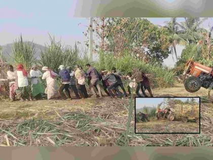 ऊसतोड मजुरांची कमाल! ऊसाची ट्रॉली ओढण्यासाठी दुसऱ्या ट्रॅक्टरऐवजी मानवी शक्तीचा वापर