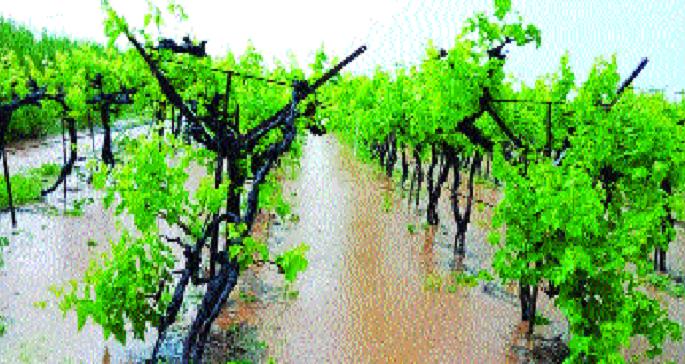 कडेगाव तालुक्यातील हणमंतवडिये येथील राहुल मोरे यांच्या द्राक्षबागेत अतिवृष्टी आणि अवकाळी पावसाने पाणी साचले आहे. यामुळे द्राक्षबागेला धोका निर्माण झाला आहे.