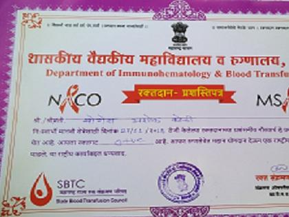 तपासणीनंतर तिच्या शरीरात केवळ ६ टक्के रक्त असल्याचे सांगून डॉक्टरांनी तिला रक्त चढविण्याची मागणी केली. त्यासाठी पर्यायी रक्तपुरवठा करण्याच्या सूचना दिल्या. त्याप्रमाणे येथील रक्तपेढीमध्ये अल्लाबक्ष चौधरी, प्रदीप साळुंखे व योगेश कोळी या तिघांनी रक्तदान केले. रक्तदानाची पावती, त्यावर संबंधित रुग्णाच्या नावाचा उल्लेख व प्रमाणपत्रही रक्तदात्यांना देण्यात आले.