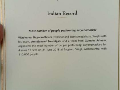 या ऐतिहासिक क्षणाची नोंद जागतिक मान्यताप्राप्त एशियन बुक ऑफ वर्ल्ड रेकॉर्ड, मार्व्हलस बुक ऑफ वर्ल्ड रेकॉर्ड, हाय रेंज बुक ऑफ वर्ल्ड रेकॉर्ड आदि ठिकाणी यापूर्वीच झाली आहे. सर्वाधिक लोकांनी एकत्र येवून सूर्यनमस्कार योग साधना करण्याचा हा ऐतिहासिक क्षण असल्याच्या शब्दात वर्ल्ड बुक रेकॉर्डच्या प्रतिनिधींनी मोहोर उमटवली.