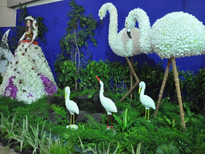 गुलाब, जर्बेरा, कार्निशियन, कॉला लिली, ऑर्किड, अॅन्थोरियम, सिमोडियम, हायड्रेनजिआ, लिलियम आदी फुलांच्या रचना येथे आहेत. फुलांनी सजविलेली बाहुली, पक्षी, तलाव यांचा देखावाही लक्षवेधी ठरत आहे. पुष्परचनेबरोबरच फुलांच्या रांगोळ्यांनीही प्रदर्शनात रंग भरला आहे. उद्घाटनानंतर दुपारपासून पुष्पप्रेमी नागरिकांनी प्रदर्शनाच्या ठिकाणी गर्दी केली होती. दिवसभर ही गर्दी कायम होती. फुलांच्या विश्वात रमतानाच फुलांसोबत, देखाव्यांसोबत सेल्फी घेण्याचा मोह प्रत्येकाला होत होता.