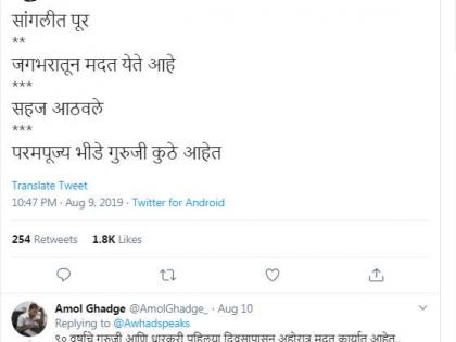 दरम्यान, सांगली आणि कोल्हापुरात महापूर आला असताना आदरणीय संभाजी भिडे गुरुजी कुठं आहेत? असा प्रश्न राष्ट्रवादी काँग्रेसचे नेते आमदार जितेंद्र आव्हाड यांनी विचारला होता. आव्हाड यांच्या या ट्विटला अनेकांनी रिप्लाय देत, भिडे गुरूजी पहिल्या दिवसांपासून कामात मग्न असल्याचे सांगत होते. विशेष म्हणजे, 11 ऑगस्ट रोजी भिडे यांच्या एका कार्यक्रमाचे पत्रकही सोशल मीडियावर व्हायरल झाले होते. त्यावरुनही, भिडे गुरुजी 32 मन सोन्याच्या सिंहासनासाठी मग्न असल्याचे सांगत त्यांच्यावर टीका करण्यात येत होती. मात्र, या टिकेलाही अनेकांनी भिडे यांच्या पूरभागातील मदकार्याचे फोटो टाकून उत्तर दिले. त्यानंतर, आता स्वत: सैन्यातील जवानाने निरोप घेताना, शिवप्रतिष्ठान हिंदुस्थानच्या कार्यकर्त्यांना सॅल्यूट केला आहे. संभाजी भिडे हे शिवप्रतिष्ठान हिंदुस्थान या संघटनेचे संस्थापक आहेत.