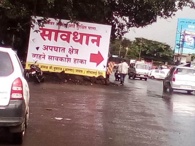 त्यामुळे आता बांधकाम विभाग दुहेरी फेºयात अडकला होता. याबाबत ‘लोकमत’ने सचित्र वृत्त प्रसिध्द केले होते. या वृत्ताची दखल घेत खेडचे तंटामुक्त समितीचे अध्यक्ष युवराज जाधव व शोभा शिंदे यांनी स्वत: पुढाकार घेऊन भला मोठा दिशादर्शक फलक उभारला आहे. या फलकामुळे आता मातीचा भराव दिसत नाही. वाहनधारक आपोआप वळण घेऊन पुढे मार्गक्रमण करत आहेत.