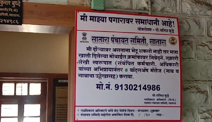 सातारा पंचायत समितीत नव्याने रूजु झालेले गटविकास अधिकारी सतिश बुद्धे यांनी आपल्या दालनाबाहेर एक बोर्ड लावला आहे. लक्षवेधक ठरलेल्या या बोर्डावर ठळकपणे मजकुर लिहीला आहे. यात ‘मी दौऱ्यावर असताना भेटू शकलो नाही तर मला खाली दिलेल्या मोबाइल क्रमांकावर निवेदने, तक्रारी, लेखी स्वरूपात (संबंधित कर्मचारी, अधिकारी यांच्या अभिप्रायानंतर व्हाॅटस अॅप मेसेज नाव व गावाच्या उल्लेखासह) करावा’ असे नमुद करण्यात आले आहे.