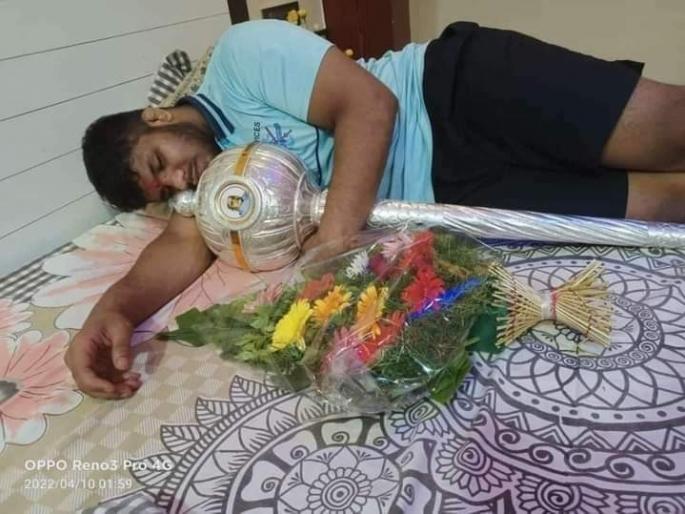 महाराष्ट्र केसरीची गदा ही विजयी पैलवानासाठी आयुष्यभराची पूंजी ठरते. त्यामुळे, या गदेसोबत पैलवानाचं भावनिक नातं जुळतं. पृथ्वीराज पाटीलचा सध्या व्हायरल होत असलेला फोटो याच नात्याची साक्ष देत आहे. त्यामध्ये, घरात जमिनीवर झोपलेला पृथ्वीराज दिसत असून त्याने अलगद ती गदा आपल्या कवेत घेतली आहे. चांदीच्या गदासोबत शांत भावमुद्रेत तो झोपला असून त्याचा हा फोटो कुणीतरी टिपला आहे. सध्या हा फोटो सोशल मीडियावर चांगलाच व्हायरल होत आहे.