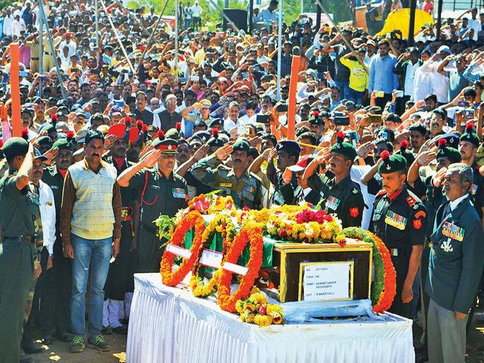 तांबवे (जि. सातारा) : ‘शहीद जवान अमर रहे... वंदे मातरम्... भारत माता की जय,’ अशा घोषणा देत शुक्रवारी मुंढे (ता. कºहाड) येथेशहीद जवान संदीप सावंत यांच्यावर शासकीय इतमामात अंत्यसंस्कार करण्यात आले. सावंत यांना अखेरचा निरोप देण्यासाठी हजारोंचा जनसमुदाय उपस्थित होता.जवान संदीप रघुनाथ सावंत जम्मू-काश्मीरच्या राजौरी जिल्ह्यात शहीद झाले. त्यांचे पार्थिव शुक्रवारी सकाळी कºहाडात आणण्यात आले. शहरातील विजय दिवस चौकातून अंत्ययात्रा काढण्यात आली. यावेळी सैन्य दलातील अधिकारी, लोकप्रतिनिधी तसेच हजारोंच्या संख्येने नागरिक उपस्थित होते.मुंढे येथील निवासस्थानी पार्थिव पोहोचल्यानंतर कुटुंबीयांनी आक्रोश केला. उपस्थितांनाही अश्रू अनावर झाले. हजारोंनी आपल्या लाडक्या वीर जवानाला मानवंदना दिली. मोठे बंधू सागर यांनी संदीप यांच्या तीन महिन्यांच्या रिया या चिमुकलीला तळहातावर घेऊन चौथºयावर नेले. सैन्यदलाने हवेत बंदुकीतून फैरी झाडून मानवंदना दिल्यानंतर पार्थिवाला भडाग्नी देण्यात आला.आई, पत्नीचा हृदय पिळवटणारा आक्रोशसंदीप यांचे पार्थिव घरानजीक पोहोचल्यानंतर आई अनुसया व पत्नी सविता यांनी आक्रोश केला. पंधरा दिवसांपूर्वी ज्या मुलाला मिठीत घेऊन निरोप दिला त्या मुलाचे पार्थिव पाहिल्यानंतर आईने हंबरडा फोडला. मुलीच्या नामकरणासाठी आल्यानंतर ज्याच्यासोबत मुलीला घेऊन तिच्या जन्माचा आनंद साजरा केला ते पती त्या दिवशी अखेरचा निरोप घेऊन गेल्याच्या जाणिवेने पत्नी सविता यांनीही आक्रोश आवरता आला नाही.