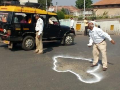 प्रशासनाचे लक्ष वेधण्यासाठी वाहतूक मित्र मधुकर शेंबडे यांनी पोवई नाका परिसरातील दहा ते पंधरा खड्ड्यांभोवती रांगोळी काढली. तसेच खतरा असे लिहून अनेक ठिकाणी चिन्हही काढले होते.