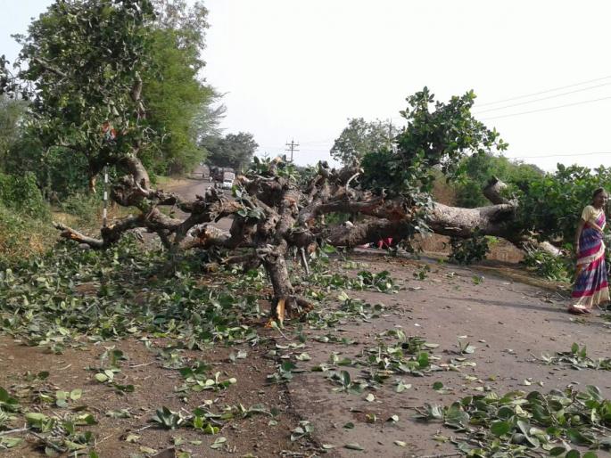 दरम्यान, सातारा-सांगली जाणाऱ्या रस्त्यावर वडी येथे वडीचे झाड उन्मळून पडल्याने वाहतूक ठप्प झाल्याने सकाळी औंधवरून पुसेसावळी व पुसेसावळीकडूून औंधकडे जाणारी वाहतूक थांबली आहे. काही वाहनांनी नवीन झालेल्या कळंबी-गणेशवाडी-औंध-रस्त्याचा वापर केला. पुसेसावळीतून औंधमार्गे सातारा जाणारी वाहतूक नागझरी, वाठार, रहिमतपूर अशी सुरू होती.फांद्या कापण्यास सुरूवातपडलेल्या वडाच्या झाडाला हटविण्यासाठी प्रशासनाची वाट न पाहता वडी ग्रामस्थांनी सोमवारी सकाळी दहाच्या सुमारास झाड हलविण्यासाठीचे प्रयत्न सुरू केले. मोठ्या फांद्या कुऱ्हाड व इतर अवजारांच्या मदतीने कमी करून एका बाजूने वाहनांना रस्ता उपलब्ध करून देण्याचे प्रयत्न सुरू आहेत.