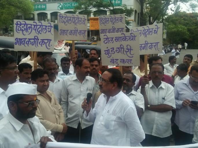 गेल्या वर्षभरात डिझेलच्या दरात जवळजवळ दीडपट वाढ झाली आहे. वाढलेल्या दरामुळे वाहतूकदारांना व्यवसाय करणे अवघड झाले आहे. डिझेलच्या दरावर केंद्र आणि राज्य सरकार यांचे भरमसाट कर आहेत. हे कर त्वरीत कमी करण्यात यावेत. असे झाले नाही तर वाहतूक व्यवसाय अगोदरच अडचणीत आला आहे. अशा प्रकारामुळे तो नाश होण्याची शक्यता आहे, असे गवळी यांनी सांगितले.दरम्यान, यानंतर जिल्हाधिकाऱ्यांना निवेदन देण्यात आले. यावेळी इंधन दरवाढ,टोलनाक्यावरील अनागोंदीबाबत चर्चा करण्यात आली. या मोर्चात संघटनेचे सचिव धनंजय कुलकर्णी यांच्यासह वाहतूकदार मोठ्या संख्येने सहभागी झाले होते.टोल नाक्यावर क्रेन, रुग्णवाहिकेचा अभाव...आनेवाडी आणि तासवडे टोलनाक्याच्या ठिकाणी शासनाबरोबर झालेल्या कराराप्रमाणे कोणत्याही गोष्टीची पूर्तता संबंधितांकडून केली जात नाही. याउलट त्रास देऊन अधिक पैशांची मागणी केली जाते. टोल नाक्यावर क्रेन, रुग्णवाहिका उपलब्ध नसतात. अपघातानंतर कोणतीही मदत तातडीने मिळत नाही. वजन काट्याचा दुरूपयोग केला जातो, असा आरोपही यावेळी करण्यात आला.