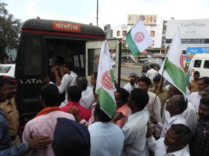 आंदोलक कार्यकर्ते या ठिकाणी ठिय्या मांडून बसले. त्यामुळे या मार्गावरील वाहतूक काही काळ थांबली. मात्र पोलिसांनी कार्यकर्त्यांना ताब्यात घेऊन पोलीस ठाण्यात नेल्यानंतर वाहतूक पुन्हा पूर्ववत झाली. शेतक-यांना लूटवापसी म्हणून संपूर्ण कर्जमुक्ती द्या, शेतकरी पुन्हा कर्जाच्या विळख्यात अडकू नये, यासाठी शेतीमालाला दीडपट भावाची हमी मिळेल अशी धोरणे स्वीकारावी, नैसर्गिक आपत्तीमध्ये शेतक-यांना ख-या अर्थाने संरक्षण मिळेल, अशी पीक विमा योजना सुरू करावी, कसत असलेल्या जमिनीचे हक्क कसणाºयांच्या नावे करावी व शेतीच्या सर्वंकष, शाश्वत व गतिमान विकासासाठी डॉ. स्वामिनाथन आयोगाच्या शिफारशींनुसार पर्यायी शेती धोरणाची आखणी करावी, या मागण्या करण्यात आल्या.