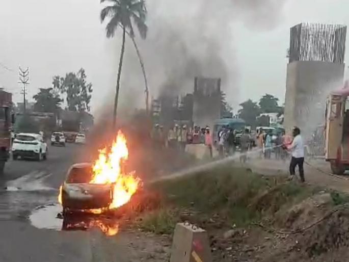 सातारा : कोल्हापूरकडून पाटणच्या दिशेने निघालेल्या चालत्या कारला अचानक आग लागल्याने मलकापुरात महामार्गावर द बर्निंग कारचा थरार पाहायला मिळाला. येथील शिंदे होंडा शोरूमसमोर सायंकाळी पाच वाजण्याच्या सुमारास ही घटना घडली. या आगीत कार जळून खाक झाल्यामुळे लाखो रुपयांचे नुकसान झाले आहे. चालकांसह नागरिकांच्या प्रसंगावधानामुळे तिघांचे जीव वाचल्याने सुदैवाने कोणतीही जीवित हानी झाली नाही.