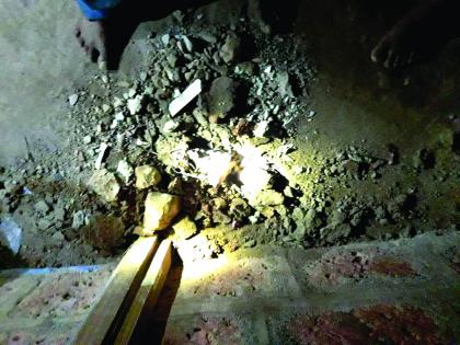 विजेचा लोळ कौले फोडून घरात आला. विजेच्या लोळाने घरात जमिनीला पडलेला खड्डा.