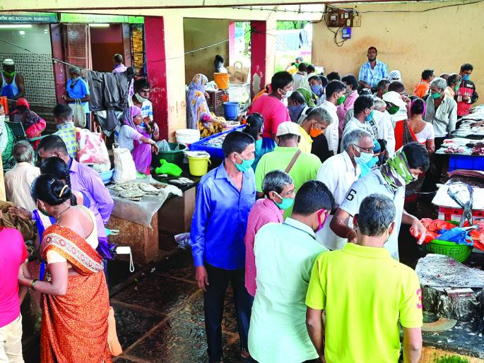 खारेपाटणमधील जनता कर्फ्यू संपताच मासळी मार्केटमध्ये नागरिकांनी गर्दी केली होती.