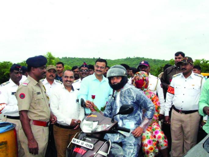 महामार्गावरून सीट बेल्ट, हेल्मेट घालून प्रवास करणाऱ्या प्रवाशांचा वाहतूक पोलिसांकडून पुष्पगुच्छ देऊन गौरव करण्यात आला. यावेळी सहाय्यक पोलीस निरीक्षक अरूण जाधव, संजय डौर व कर्मचारी उपस्थित होते.