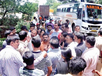 रास्तारोको आंदोलनाच्या ठिकाणी राष्ट्रीय महामार्ग प्राधिकरणचे उपअभियंता प्रकाश शेडेकर कर्मचाऱ्यांसह दाखल झाले. त्यांनी आंदोलनकर्त्यांशी चर्चा केली. खड्डे तत्काळ बुजविण्याचे त्यांनी मान्य केले. मात्र, रास्ता रोकोनंतर तीन तास विलंबाने येणाऱ्या उपअभियंता प्रकाश शेडेकर यांना पोलीस निरीक्षक शिवाजी कोळी यांनी धारेवर धरले. यापुढे आंदोलकांना त्वरित सामोरे जा, अन्यथा, फौजदारी कारवाई करू, असा इशारा शिवाजी कोळी यांनी यावेळी दिला.