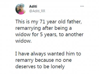 @Aditi_RR यांनी हा फोटो ट्विट करताना कॅप्शन दिलं आहे की, 'हे माझे वडील आहेत त्याचे वय ७१ वर्ष आहे. त्यांनी ५ वर्षापर्यंत विधूर राहिल्यानंतर त्यांनी दुसरं लग्न करण्याचा निर्णय घेतला आहे. मला नेहमीच असं वाटायचं की त्यांनी दुसरं लग्न करायला हवं. कारण कोणीही एकटं जीवन जगू शकत नाही.'