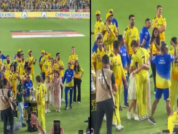 व्हायरल होत असलेल्या व्हिडीओमध्ये पाहायला मिळते की, धोनी ट्रॉफीच्या शेजारी उभा राहिला आहे, तर त्याची पत्नी साक्षी अन् मुलगी झिवा त्याच्या समोरील बाजूला आहेत. साक्षी धोनीला आपल्याकडे येण्याचा इशारा करते. पत्नीनं केलेल्या सततच्या इशाऱ्यांनंतर धोनी साक्षी आणि झिवाकडे जाऊन त्यांना मिठी मारतो.