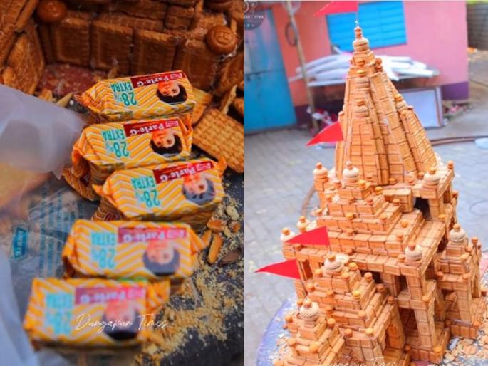 युवकाने २० किलो पारले जी बिस्किटांचा उपयोग करुन राम मंदिर प्रतिकृती निर्माण केली आहे. विशेष म्हणजे मंदिराची हुबेहुब प्रतिकृती या बिस्कीटांमधून दिसत आहे. त्यामुळे, सोशल मीडियावर या कलाकृतीचं व बनवणाऱ्या युवकांचही जोरदार कौतुक केलं जातंय.