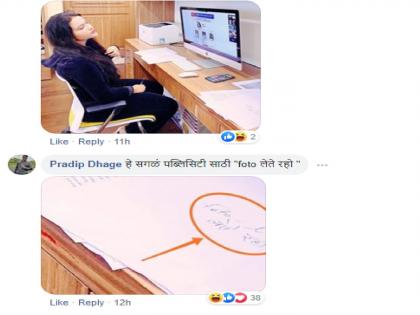 या पोस्टमध्ये अमृता फडणवीस कॉम्प्युटरसमोर खुर्चीवर बसलेल्या दिसतात. मात्र फोटोच्या एका कोपऱ्यात दिसणाऱ्या कागदावर हलकसा मजकूर हाताने लिहिलेला दिसत आहे. याच मजकुरावरुन सध्या अमृता फडणवीस नेटिझन्सचं लक्ष्य ठरल्यात. अमृता फडणवीस यांचा फोटो झूम करून पाहिला, तर एका कागदावर ‘फोटो लेते रहो’ अशी सूचना लिहिलेली दिसते. तीच चर्चेचा आणि चेष्टेचा विषय ठरलीय.