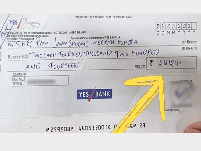 नवी दिल्ली: अयोध्येतल्या भव्य राम मंदिरासाठी (Ayodhya Ram Mandir) गेल्या ४४ दिवसांपासून निधी गोळा केला जात आहे. काल (शनिवारी) निधी संकलन अभियानाची सांगता झाली. गेल्या दीड महिन्यांत अनेकांनी राम मंदिरासाठी यथाशक्ती दान केलं. त्यात सर्वसामान्यांपासून राजकारणातील अनेक दिग्गजांचा समावेश आहे. मात्र राम मंदिरासाठी एका व्यक्तीनं दिलेल्या २ लाख १४ हजार २१४ रुपयांच्या धनादेशाची सर्वत्र चर्चा आहे.सोशल मीडियावर 'रामराम' म्हणून व्हायरल झालेल्या धनादेशामागे एक विशेष कारण आहे. राम मंदिरासाठी २ लाख १४ हजार २१४ रुपयांचं दान देणाऱ्या व्यक्तीनं धनादेशावर हा आकडा इंग्रजीत लिहिला आहे. हा आकडा (2,14,214) असा लिहिण्यात आला आहे की तो वाचताना देवनागरीत 'रामराम' असाही दिसतो. त्यामुळे धनादेश लिहिणाऱ्या सर्जनशीलतेचं अनेकांनी कौतुक केलं आहे.