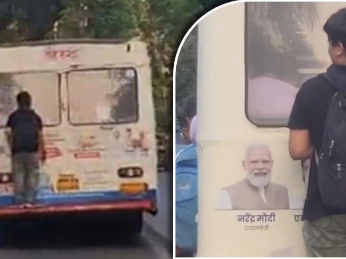 अनेकदा बस किंवा ट्रेनमध्ये प्रवाशांनी खचाखच भरलेल्या गर्दीत उभे राहण्यासाठीही जागा नसते. त्यामुळे बसला लटकून किंवा धावती बस पकडण्याचे जीवावर बेतणारे साहस प्रवासी करताना दिसतात. या व्हायरल व्हिडीओमध्ये तरुण बसच्या मागे उभा राहून प्रवास करतोय. मुंबईच्या वांद्रे परिसरातील हा व्हिडीओ असल्याचे सांगण्यात येत आहे. २९ नोव्हेंबरला हा व्हिडीओ शेअर करण्यात आला आहे.