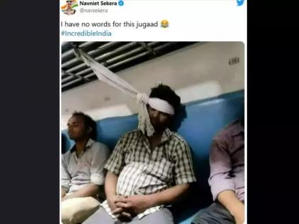 फोटोमध्ये काही प्रवासी रेल्वेने प्रवास करत असल्याचे दिसून येते. पण त्यातला एक अगदी वेगळ्या पद्धतीने झोपलेला दिसतोय. त्या व्यक्तीने देसी जुगाडने आपलं डोकं खाली पडण्यापासून रोखलं आहे. म्हणजेच जेव्हा आपण बसून झोपायला लागतो तेव्हा आपली मान एका बाजूला पडू लागते. त्यामुळे कधी कधी जोरदार धक्का बसतो आणि माणूस झोपेतून जागा होतो.