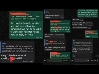 "माझ्या पत्नीला डिलिव्हरीसाठी रुग्णालयात दाखल करण्यात आलं होतं. मी माझ्या मॅनेजरला सांगितलं आणि फक्त दोन दिवसांची सुटी मागितली. साधी सहानुभूती दाखवण्याऐवजी, बॉसने मला माझी सुटी पुढे ढकलण्यास सांगितली आणि "तुझे मम्मी-पप्पा हे मॅनेज करू शकतात का?" असा प्रश्न विचारला. मला रुग्णालयातून काम करण्यास सांगितलं."