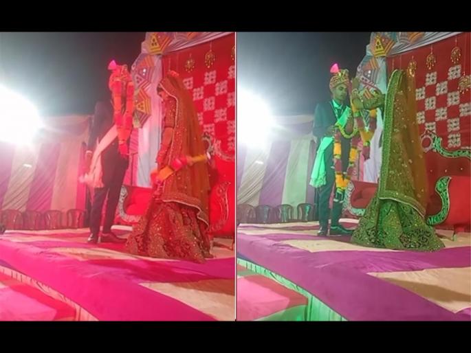 इन्स्टावर पोस्ट करण्यात आलेल्या या व्हिडीओत तुम्ही बघू शकता की, नवरी-नवरदेव एका स्टेजवर हात घेऊन उभे आहेत. आधी नवरी नवरदेवाच्या गळ्यात हार टाकते. पण नवरी हार नवरदेवाच्या गळ्यात नाही तर त्याच्या फेट्यावर टाकते आणि मागे सरकते. नंतर नवरदेवही दूरूनच हार नवरीच्या गळ्यात फेकतो. तो हारही खाली सरकत जातो. नवरदेवाचा चेहरा हाराने झाकला गेला आहे तर नवरीच्या गळ्यात हार नाही.