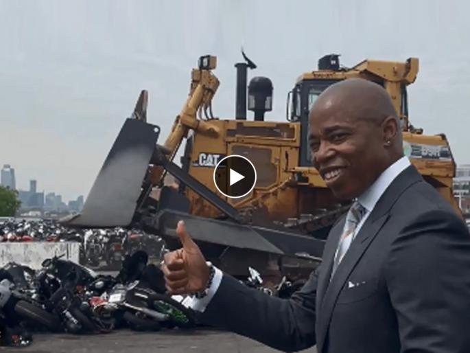 उत्तरप्रदेशात प्रचंड चर्चेत असलेला बुलडोझर आता अमेरिकेच्या न्यूयॉर्क शहरात सुद्धा त्याचा जलवा दाखवत आहे. न्यूयॉर्क शहराचे महापौर एरिक अॅडम्स यांनी शेकडो अवैध व धोकादायक दुचाकी वाहने बुलडोझरच्या मदतीने नष्ट केल्याचा व्हिडीओ व्हायरल झाला असून या कारवाईला महापौर स्वतः हिरवा कंदील दाखवत असल्याचे या व्हिडीओ मध्ये दिसते आहे.