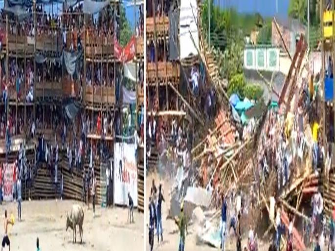 बुलफायटींग दरम्यान उद्ध्वस्त झालं प्रेक्षकांनी भरलेलं स्टॅंन्ड, बघून अंगावर येईल काटा...