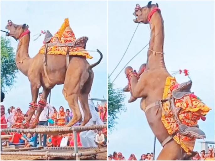 Camel Dance Video : सोशल मीडियावर नेहमीच काहीना काही व्हायरल होत असतं. कधी काय बघायला मिळेल काहीच सांगता येत नाही. कधी कधी तर काही व्हिडीओ हैराण करून सोडतात तर काही व्हिडीओ चेहऱ्यावर हसू आणतात. सध्या असाच एक व्हिडीओ लोकांना अवाक् करत आहे. ज्यात एक उंट दोन्ही पाय वर उचलून नाचताना दिसत आहे. तुम्ही लग्नात किंवा अजून कुठे घोडीला असा डान्स करताना नक्कीच पाहिलं असेल, पण उंटाचा असा व्हिडीओ नक्कीच पाहिला नसेल.