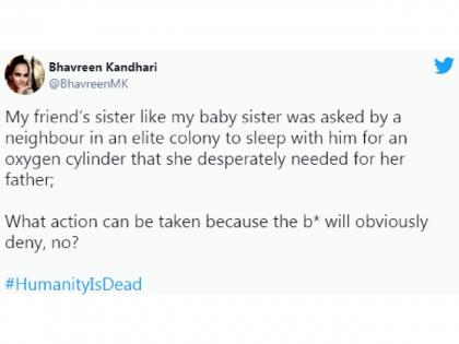 सोशल मीडिया पोस्टच्या माध्यमातून ही घटना समोर आली आहे. भावरीन कंधारी नावाच्या एक ट्विटर यूजरने हे ट्विट केलं आहे. तिने लिहिलं आहे की, 'माझ्या मित्राच्या बहिणीला तिच्या वडिलांसाठी ऑक्सीजन सिलेंडरची गरज होती. तिच्या शेजाऱ्याने सिलेंडरच्या बदल्यात तिला आपल्यासोबत झोपण्याची मागणी केली. काय यावर कारवाई केली जाऊ शकते? तो तर हेच सांगेल की मी असं बोललो नाही'.