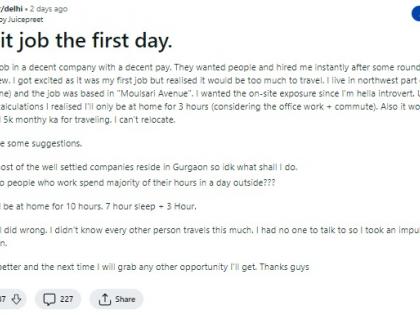 आणखी एका युजरने लिहिले की, दिल्लीतील निम्मे लोक रोज गुरुग्रामला जातात. अधिक कमाई करण्यासाठी, तुला धावावं लागेल. त्यानंतर या तरुणाला वाईट वाटलं. त्याने आपली पोस्ट एडीट करून मी घाईघाईने निर्णय घेतल्याचं लिहिलं. लोक रोज एवढा प्रवास करतात हे मला माहितही नव्हते. माझ्याशी बोलायला कोणीच नव्हतं म्हणून घाईघाईने हा निर्णय घेतला. पण भविष्यात मला जी काही संधी मिळेल त्यावर मी चांगले काम करेन असं म्हटलं आहे. एका हिंदी वेबसाईटने याबाबतचे वृत्त दिले आहे.